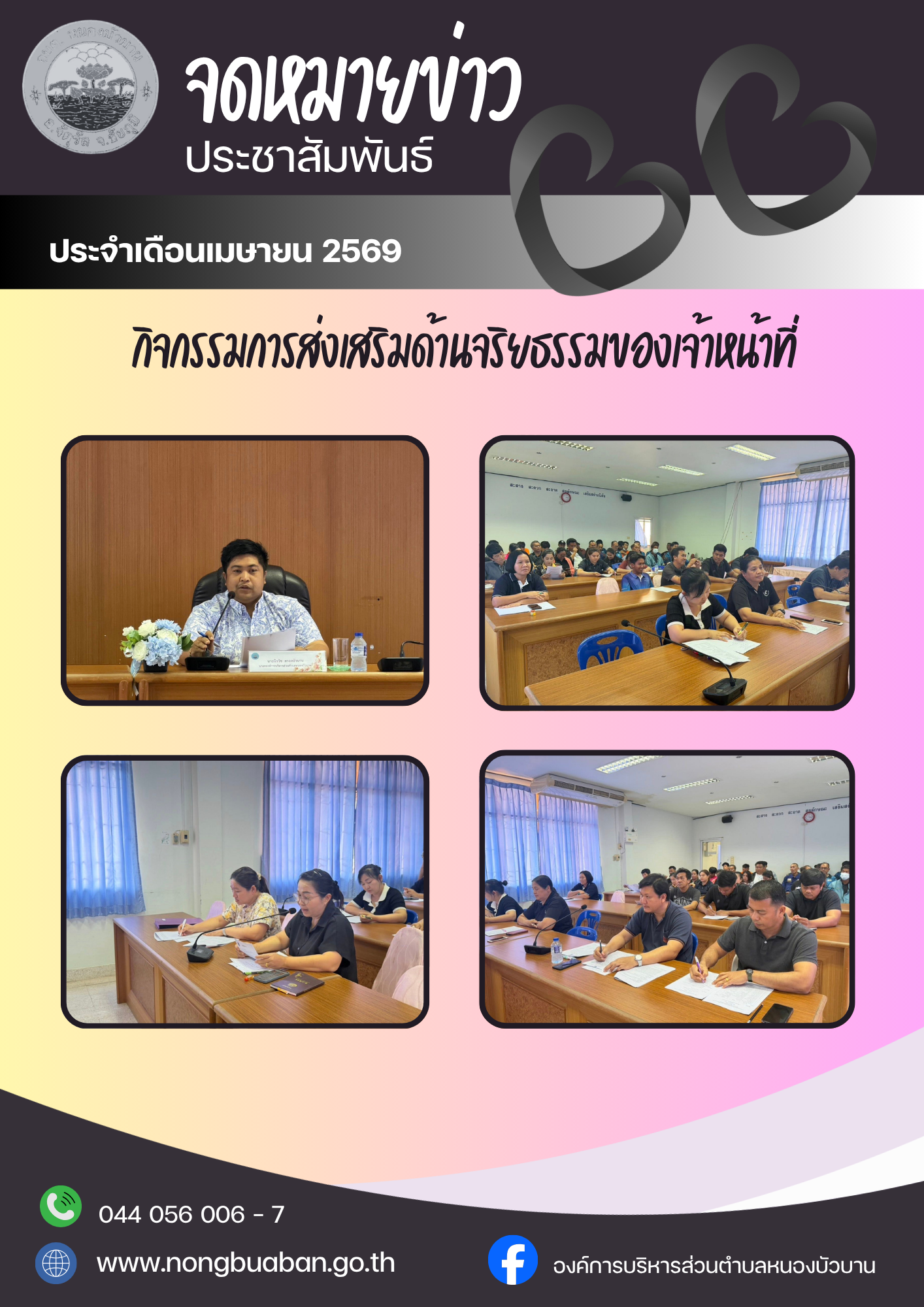 เมื่อวันที่ 3 เดือนเมษายน พ.ศ. 2569 องค์การบริหารส่วนตำบลหนองบัวบาน ได้ดำเนินกิจกรรมการส่งเสริมด้านจริยธรรม ประจำปีงบประมาณ พ.ศ.2569 โดยมีบุคลากรภายในหน่วยงาน ประกอบด้วย คณะผู้บริหาร ข้าราชการ เจ้าหน้าที่ทุกคน จำนวน 53 คน โดยมี นายนิรวัช ครองบัวบาน ตำแหน่ง นายกองค์การบริหารส่วนตำบลหนองบัวบาน เป็นประธานเปิดงาน นกิจกรรมการส่งเสริมด้านจริยธรรมในครั้งนี้มีการส่งเสริมให้บุคลากรในหน่วยงานทราบถึงรายละเอียดเนื้อหาของประกาศคณะกรรมการมาตรฐานการบริหารงานบุคคลส่วนท้องถิ่น เรื่องประมวลจริยธรรมพนักงานส่วนท้องถิ่น พ.ศ.2565 ประมวลจริยธรรมผู้บริหารท้องถิ่น พ.ศ.2565 และประมวลจริยธรรมสมาชิกสภาท้องถิ่น พ.ศ.2565 และเพื่อให้บุคลากรทุกคนภายในหน่วยงานนำหลักเกณฑ์ตามประมวลจริยธรรมไปใช้ในการปฏิบัติตน และรักษาคุณงามความดีที่เจ้าหน้าที่ของรัฐต้องยึดถือปฏิบัติโดยเคร่งครัด รวมถึงแนวทางการปฏิบัติตน ทางจริยธรรม (Do’s & Don’ts) เพื่อลดความสับสนเกี่ยวกับพฤติกรรมสีเทา