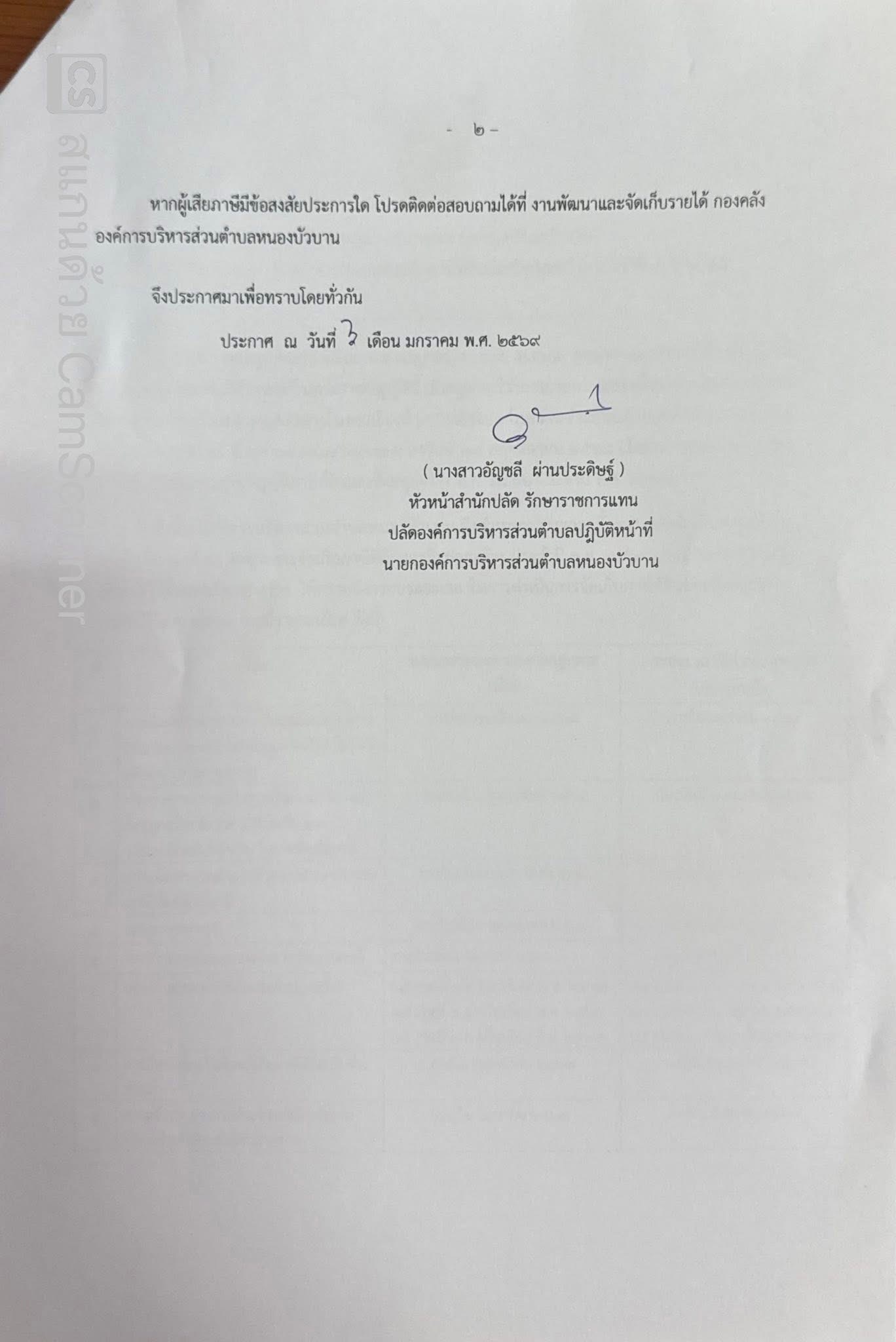 ประกาศองค์การบริหารส่วนตำบลหนองบัวบาน เรื่อง ขยายระยะเวลาการดำเนินการจัดเก็บภาษีที่ดิน และสิ่งปลูกสร้าง ประจำปี พ.ศ 2568